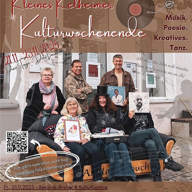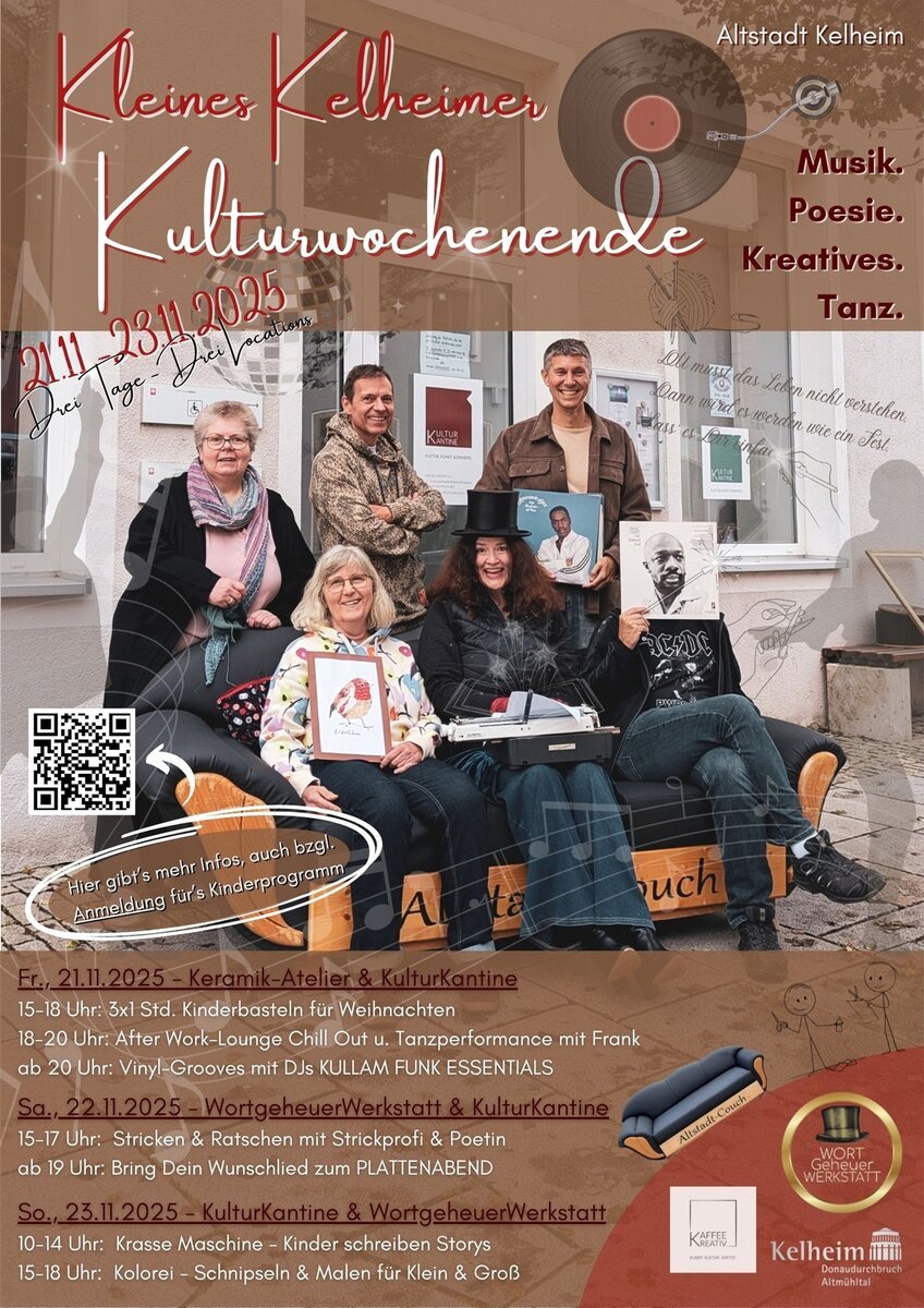 Zwischen Spitzlmarkt und Weihnachtszeit ist es soweit: Zum fünften Mal startet wieder das „Kleine Kelheimer Kulturwochenende“ mit Hauptgastgeberin Eva Honold. Unterstützt durch die Altstadtcouch und vielen mehr, gibt es auch dieses Jahr vom 21.11. bis zum 23.11.2025, drei Tage lang, wieder ein buntes Programm in drei Locations der Altstadt (Keramik-Atelier Fahrenberger, KulturKantine, Wortgeheuerwerkstatt).
